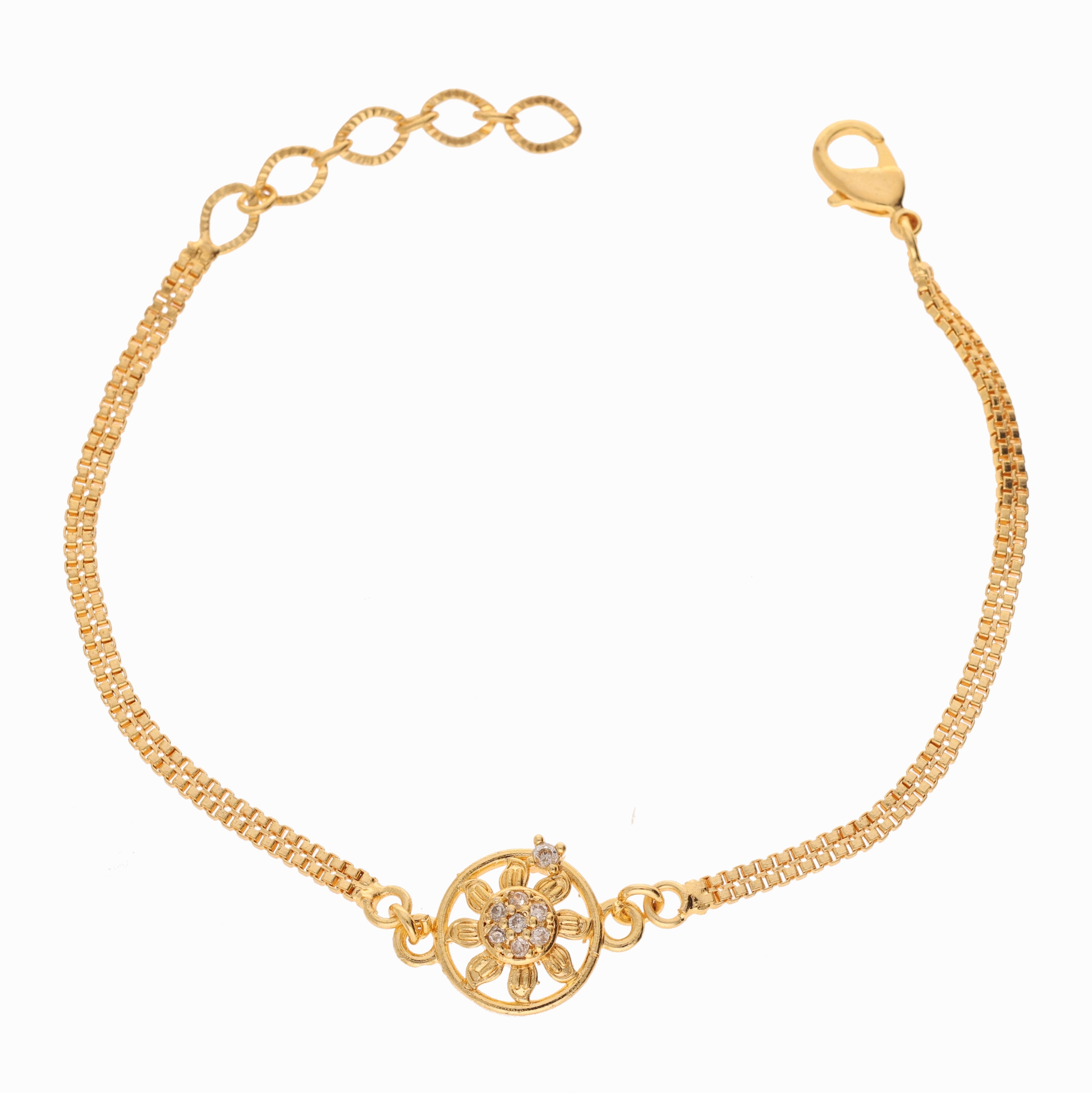 Elevate your elegance with the Anzu Dainty Floral Circle Bracelet, featuring demifine sunburst zirconia that adds a subtle yet striking shimmer. Its delicate floral circle design offers a refined balance between modern sophistication and timeless charm, making it an exquisite choice for both everyday wear and special occasions. Crafted with precision, this bracelet enhances your style with expert finesse.