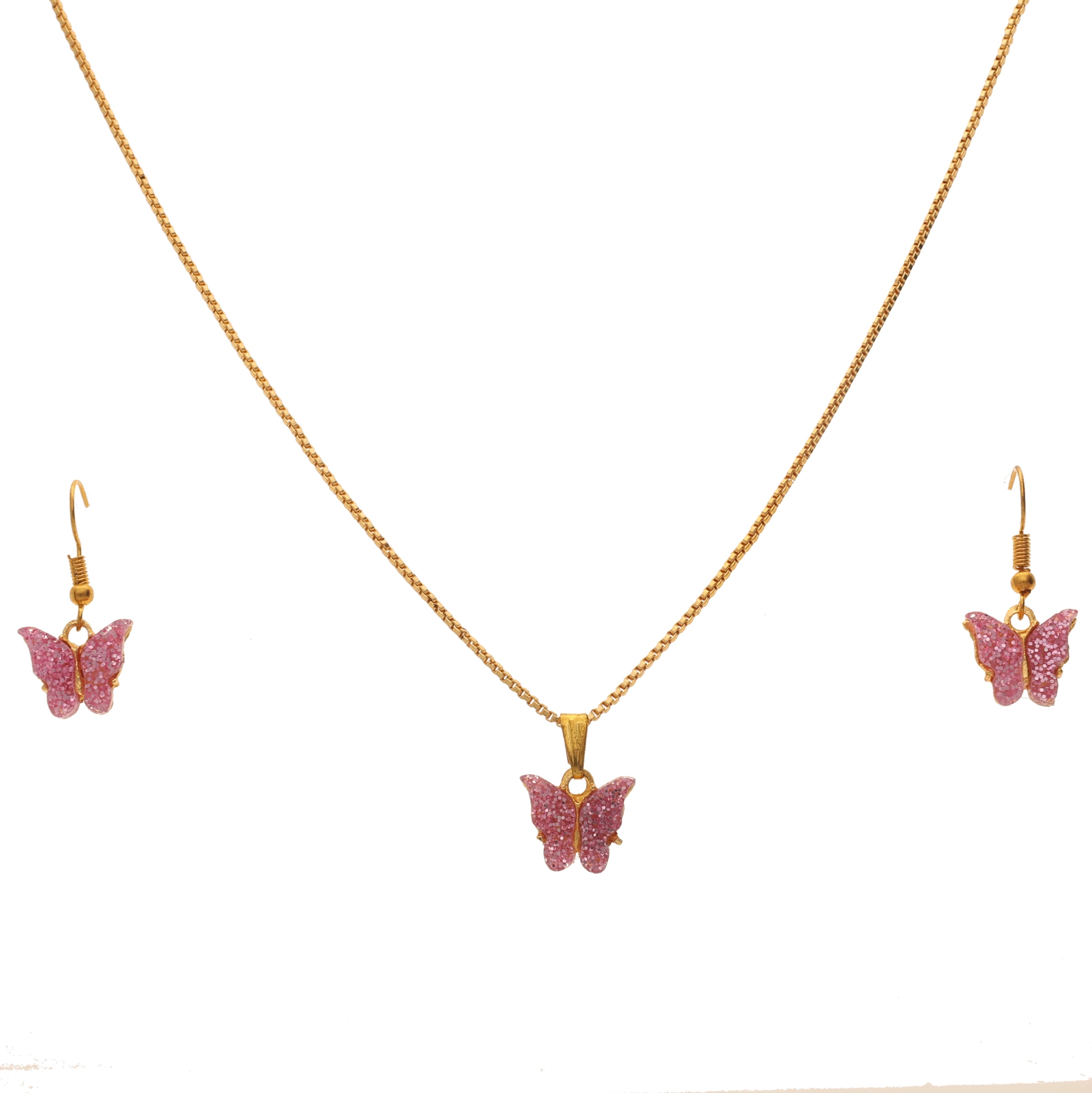 Elevate your elegance with the Anzu Pink Butterfly Jewelry Set, featuring a delicate demifine necklace paired with matching earrings. Crafted for subtle sophistication, this set enhances your look with its intricate butterfly design and soft pink hues, offering a harmonious blend of charm and refinement ideal for both everyday wear and special occasions.